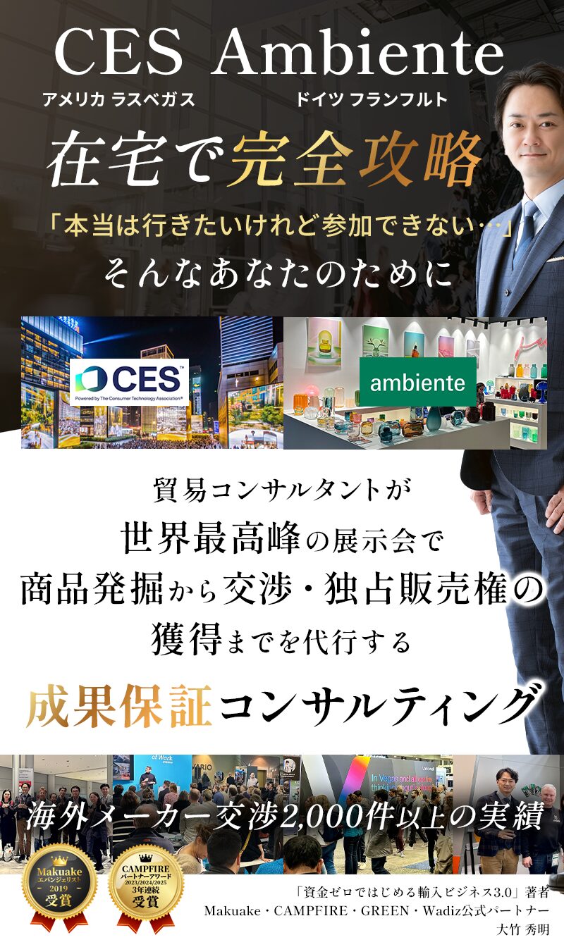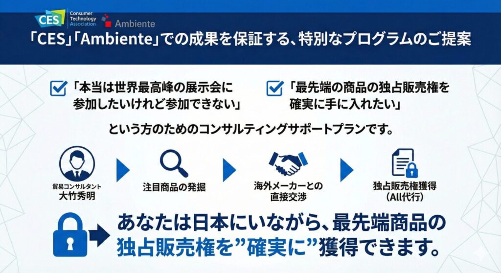 世界最大級の展示会「🇺🇸CES(シー・イー・エス)」と「🇩🇪Ambiente(アンビエンテ)」での成果を保証する、特別なプログラムをご提案します。