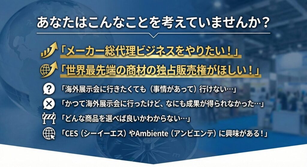 本プログラムは、「本当は世界最高峰の展示会に参加したいけれど参加できない」あるいは「最先端の商品の独占販売権を確実に手に入れたい」という方のためのコンサルティングサポートプランです。