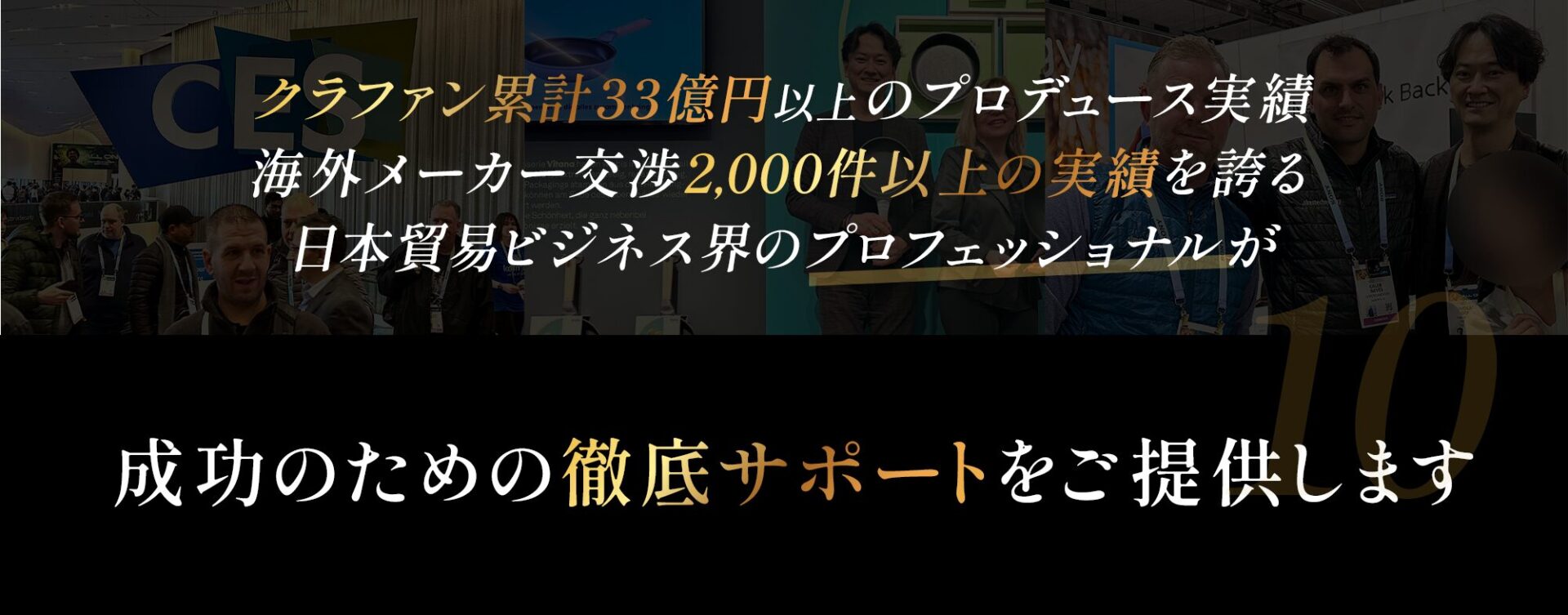 こんなお約束は、もう17年以上も世界中の展示会を飛び回り、クラファン累計33億円以上のプロデュース実績や、海外メーカー交渉2,000件(グループ全体では6,000件)以上の実績を誇る日本有数の貿易ビジネスのプロフェッショナルである私にしかできないことだと思います。(※他に横並びの実績があるコンサルタントがいらっしゃるなら教えてください)